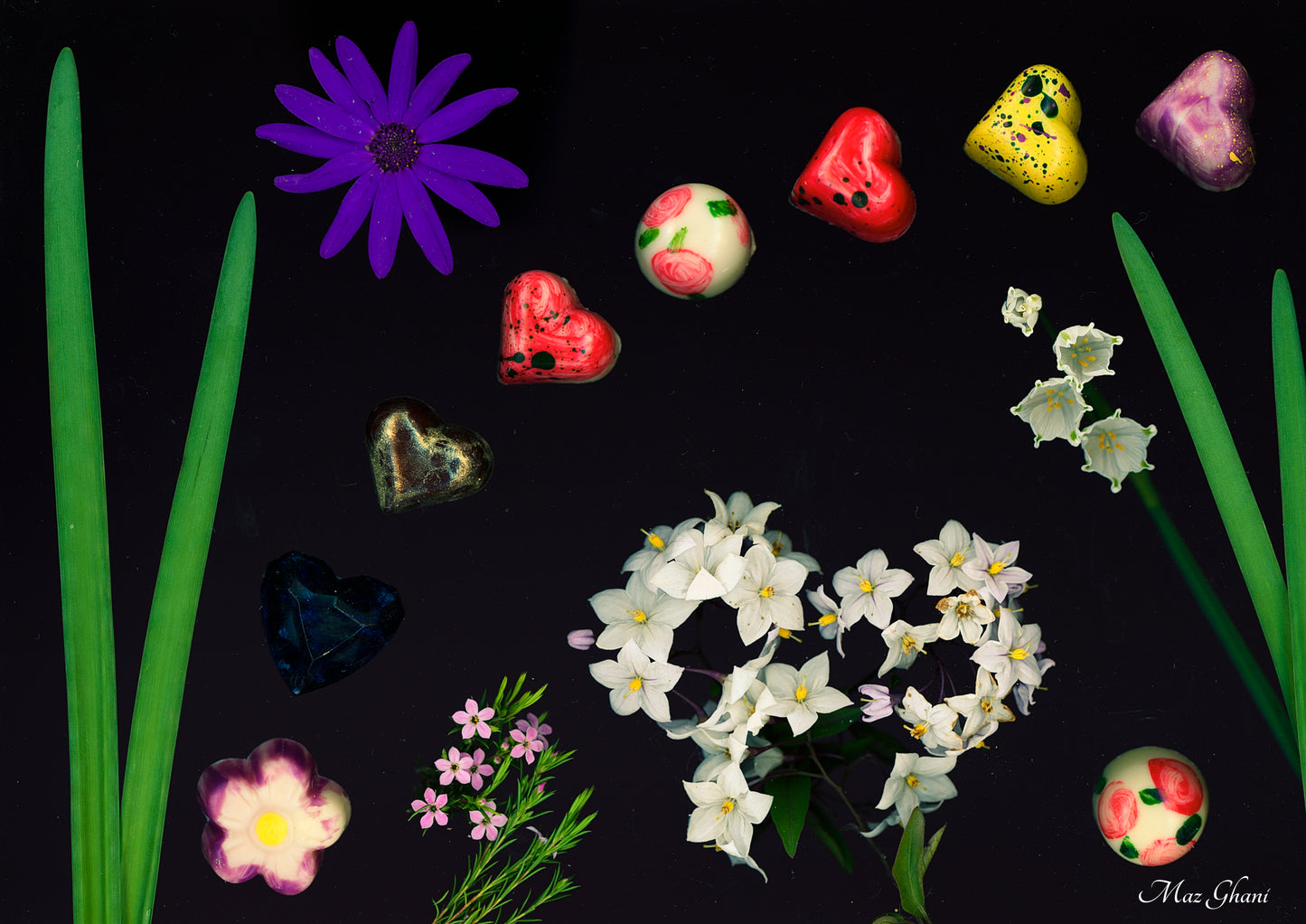 Our collaborative print includes images of homegrown flowers and hand-painted artisan chocolates.