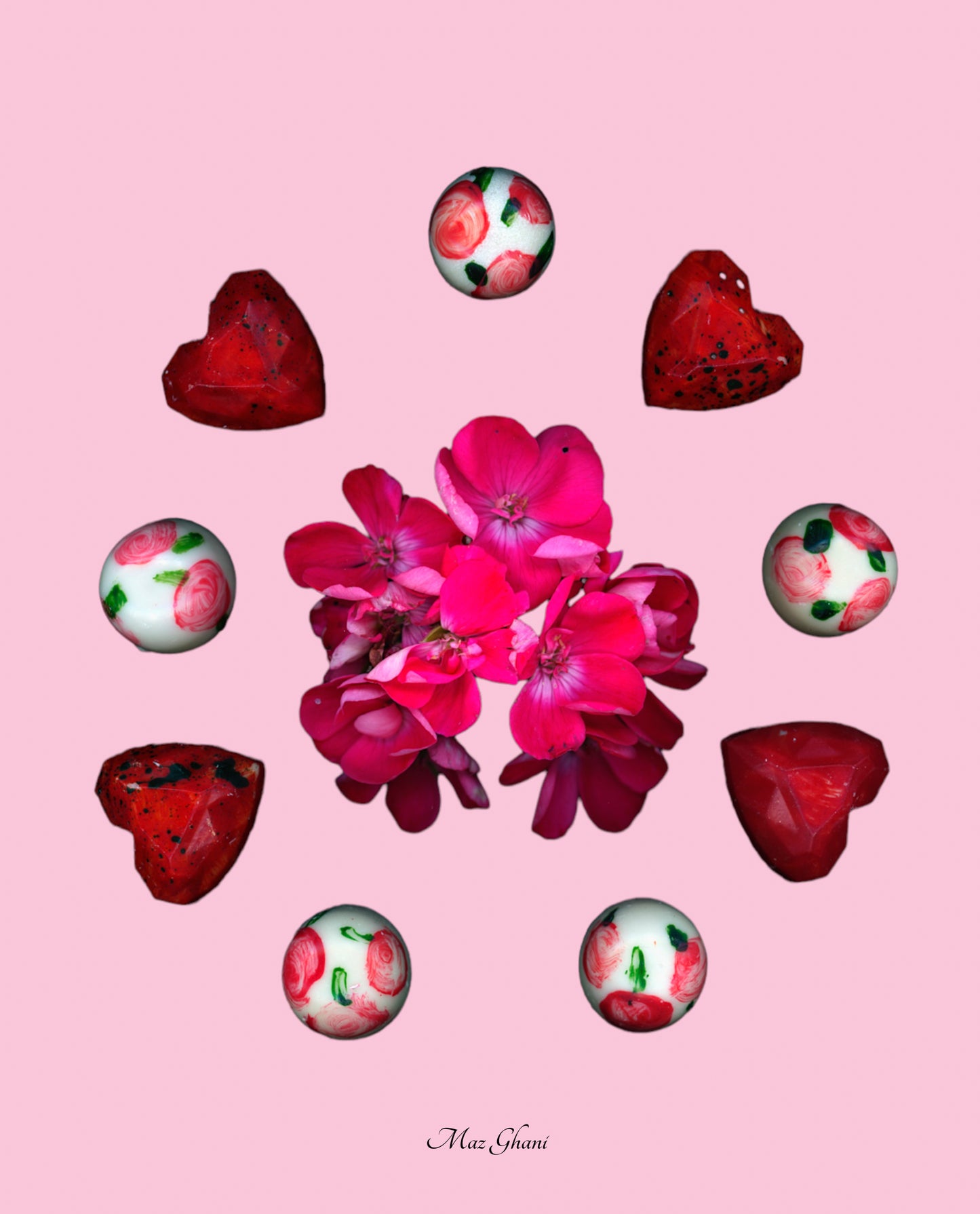 Our collaborative print includes images of homegrown flowers and hand-painted artisan chocolates.