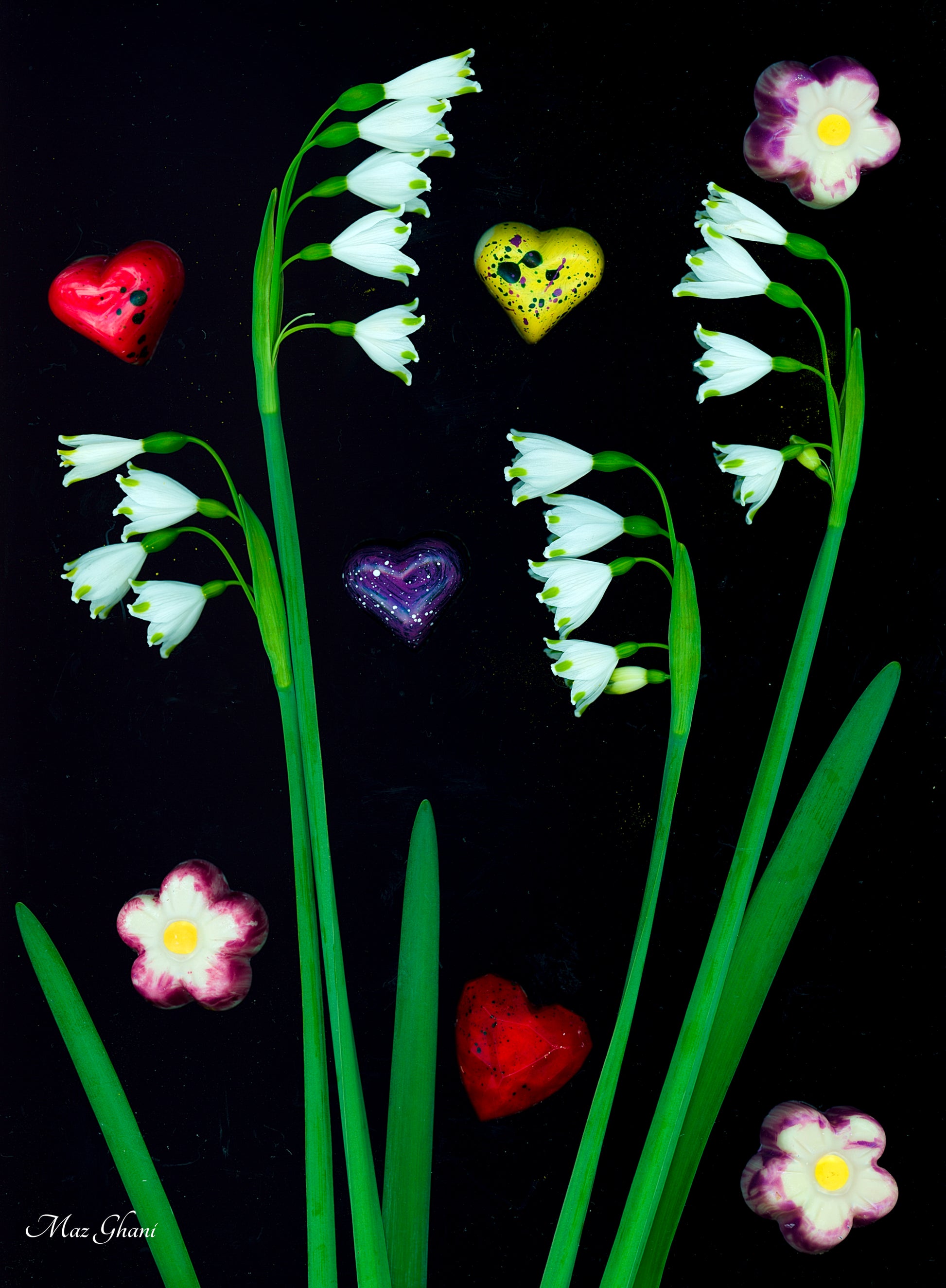 Our collaborative print includes images of homegrown flowers and hand-painted artisan chocolates.